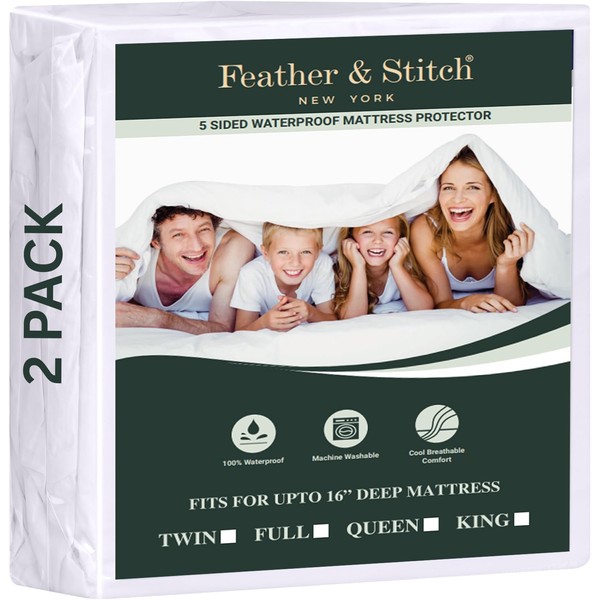 Feather & Stitch Bedding Mattress Protector Full Size (2 Pack) for Kids, Teens & Adults, 100% Waterproof Mattress Cover- Fitted Style with Deep Stretchable Pockets, Absorbent, 5-Sided Mattress Cover