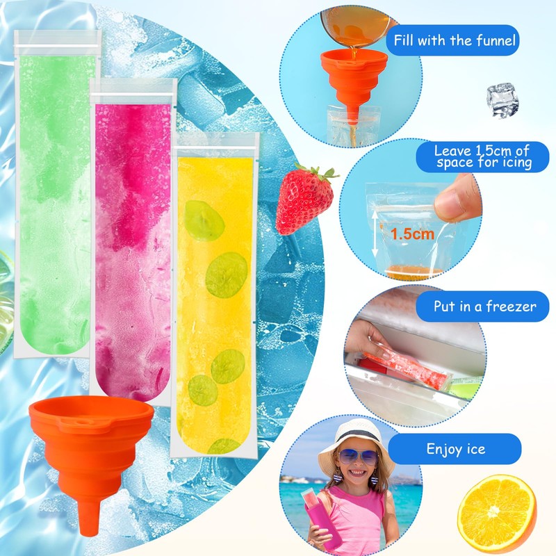 - Easy to Use: Each popsicle holders for kids set is equipped with a silicone funnel, which is very convenient to fill our popsicle bag with a size of 7.5×2 inch. Open the zipper and seal, insert the funnel and add the liquid, leaving about 1/2 inch (15 mm) space for the water to condense into ice, and then put in the refrigerator for freezing