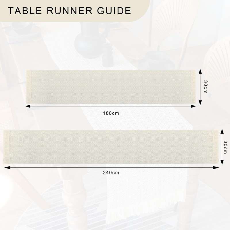 - Size Choose:Included 1 x natural macrame table runner, measures 30 x 180cm or 30 x 240cm, fits a dining table that seats 4-8 people, creates a wonderful table setting. Delicate weaved hollow striped cotton fabric and woven cotton with tassel, giving a minimalist feel and creating a relaxed feel in the room.