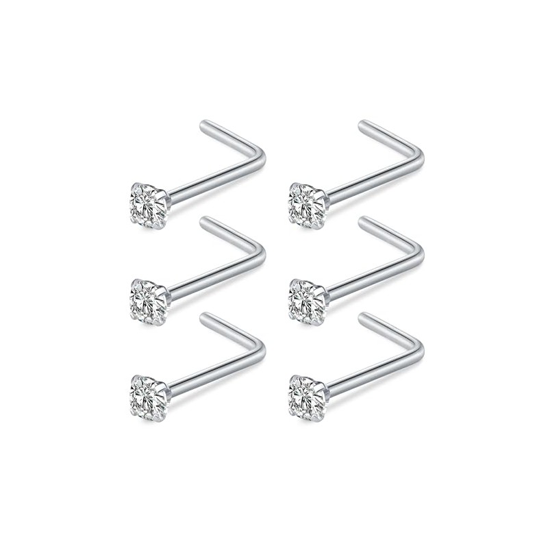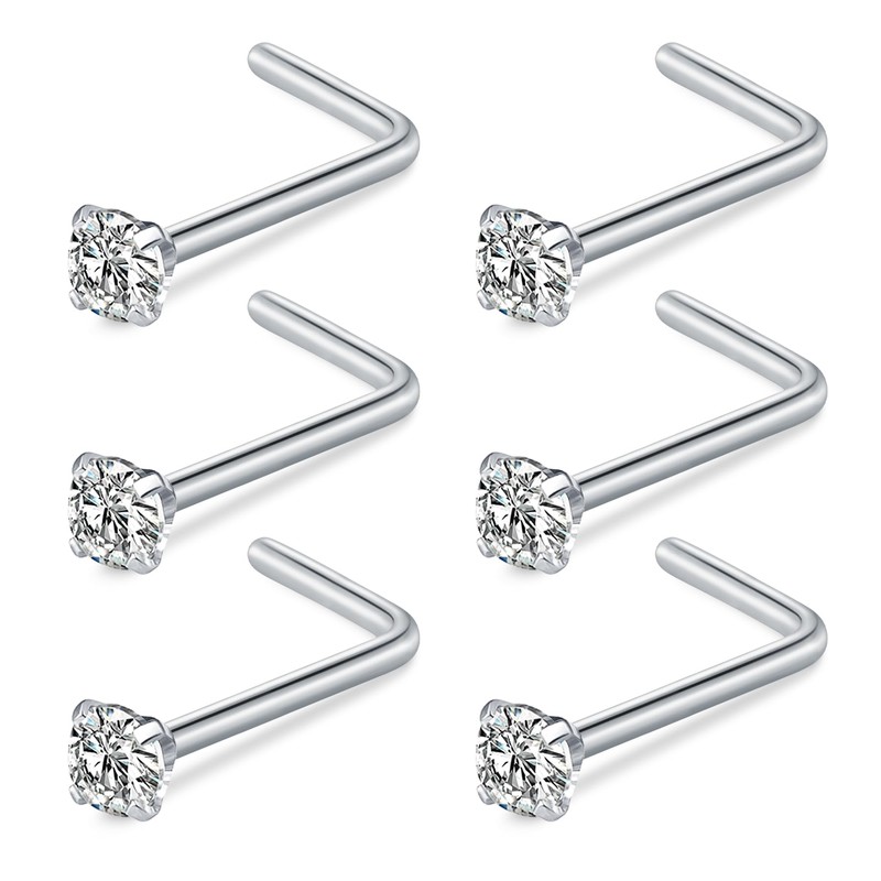 FECTAS Nose Ring L Shaped Nose Stud 20G L Bend Nose Piercing Jewellery Stainless Steel 2mm Diamond CZ Silver