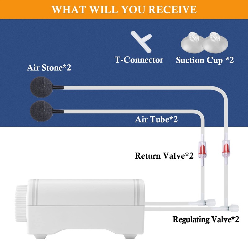 - 【All Accessories】Comes with all needed air pump accessories, includes: Air Tube(4.9FT)*2, Air Stone*2, Return Valve*2, Suction Cup*2, Regulating Valve*2, T Connector*1. We provide a 12-month warranty for this air pump, please feel free to contact us if you have any questions, our after-sales team will reply within 24 hours.