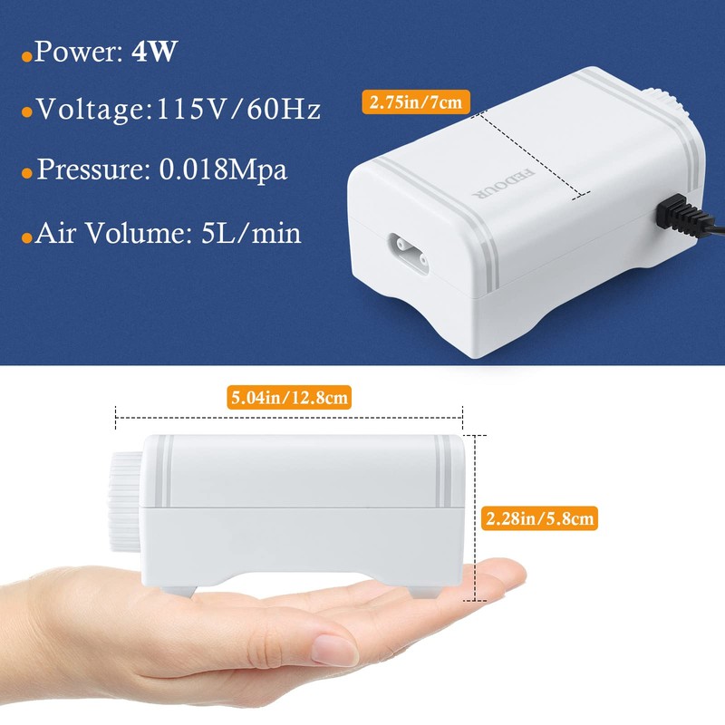- 【Specifications】FEDOUR silent aquarium air pump, Power: 4W, Voltage: 115V/60Hz, Pressure: 0.018Mpa, Air Volume: 80GPH, Size: 5.04*2.75*2.28in. Suitable for 1-100gallon fish and turtle tank.
