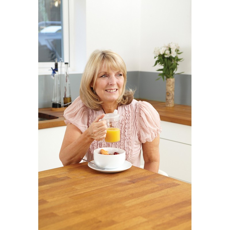 Made from shatterproof clear plastic, that allows for monitoring of fluid intake, these Feeding Cups have a good capacity and large open handles, that are easy to grip and improve ease of use. Each feeding cup is suitable for use with both hot and cold liquids and is supplied with a choice of two lids to suit different situations and user needs. One of the lids supplied has a standard feeding spout on one side and a vent hole on the other, which allows the user to control the flow of fluid simply by covering the vent with a finger.The other lid supplied with the feeding cups is the anti splash lid, this lid is a recessed lid and as such is more discrete than a standard spouted lid. The anti splash lids help to prevent accidental spillages whilst at the same time allowing the user to control the flow of fluid. The Feeding Cups are dishwasher and microwave safe.