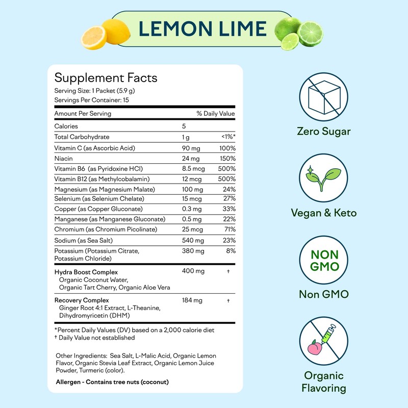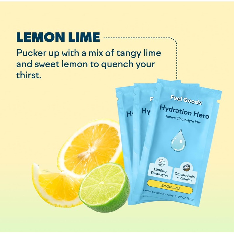Feel Goods Hydration Hero, 1,000mg Electrolytes Powder, Sugar Free, Magnesium, Organic Aloe Vera, L Theanine, Vitamin C & B12, Non GMO, Keto, Vegan, Electrolyte Packets | Lemon Lime, 15 Count
