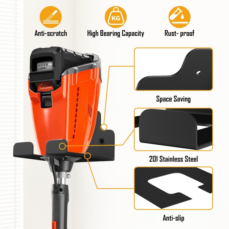 - Versatile Power Tool Holder: Designed to accommodate various garden tools, our trimmer rack serves as the perfect power tool organizer. Whether you're storing hedge trimmers, weed trimmers, or garage tools, this wall mount solution provides excellent grip and stability, ensuring your tools are secure and easily accessible