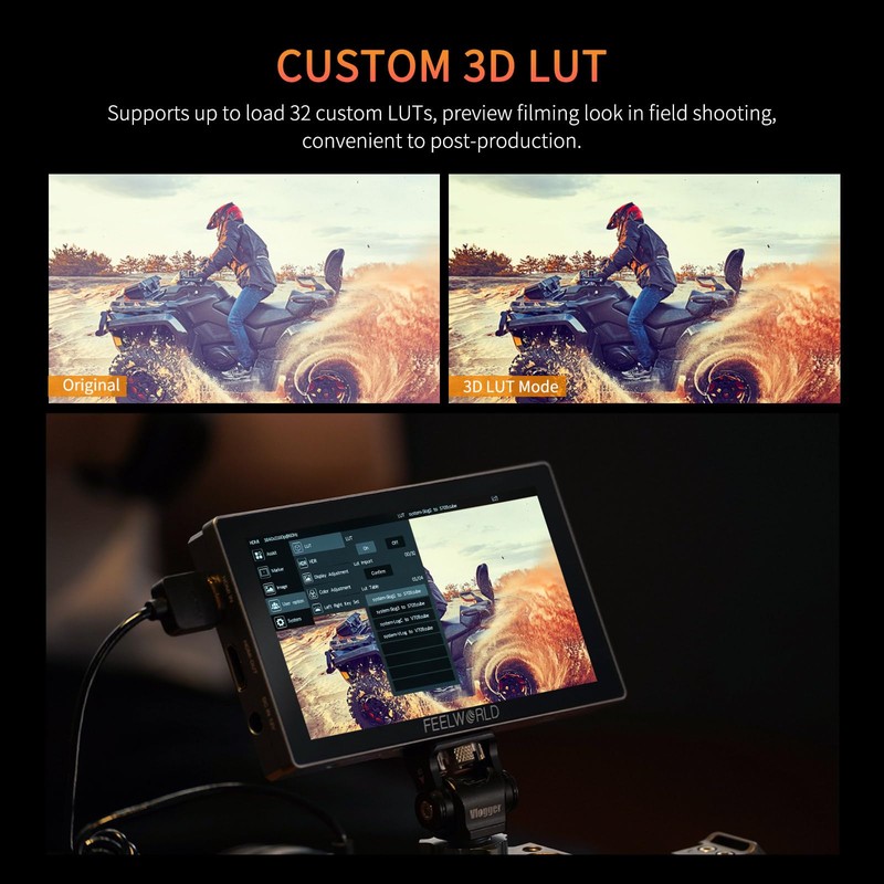 - 【Professional Moniting Software/Customized 3D LUT】P6X camera monitor is equipped with a variety of professional moniting functions, such as waveform graph, vector graph, luminance histogram, assisted focus, audio column, image flip, false color and so on. By importing 3D LUT through SD card, photographers can realize various creative effects in post-editing