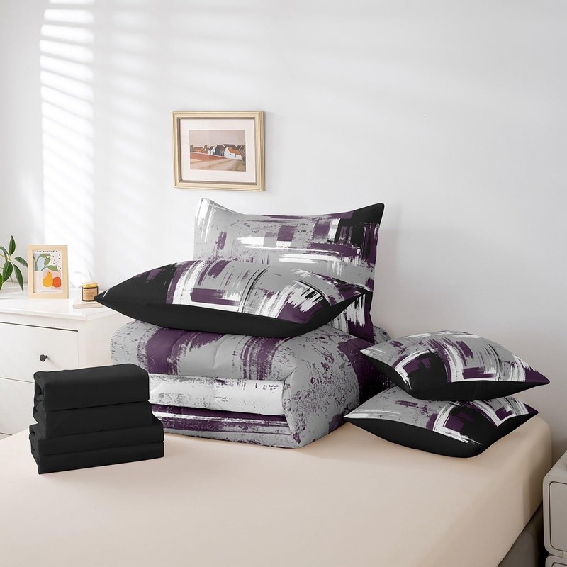 Feelyou Abstract 7 Piece Bedding Set Modern Abstract Art Bed in a Bag Purple Grey Black Comforter Lightweight Retro Bed Set Includes Comforter, Sheet Set, Pillowcases & Pillow Covers Full Size