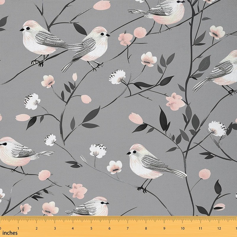 Feelyou Birds Fabric by The Yard, Cute Birds Tree Branches Upholstery Fabric for Chairs, Farmhouse Nature Leaves Botanical Animal Decorative Waterproof Outdoor Fabric, 1 Yard, Gray Pink