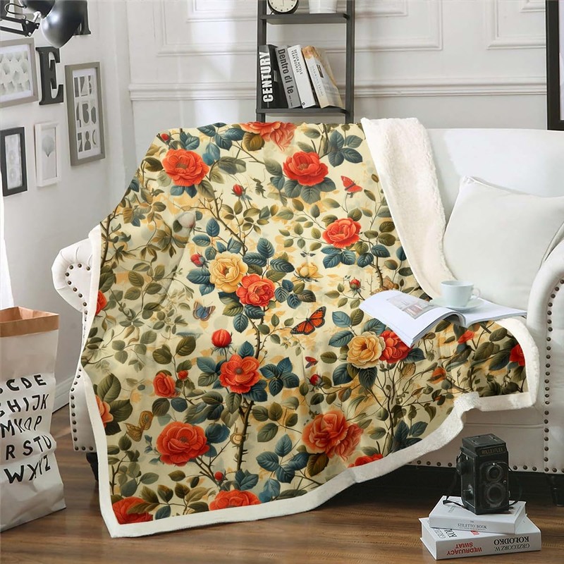 Feelyou Flower Fleece Throw Blanket for Bed Sofa Couch Kids Throw 50"x60" Butterfly Plush Blanket Leaves Sherpa Blanket Olive Yellow Fuzzy Blanket