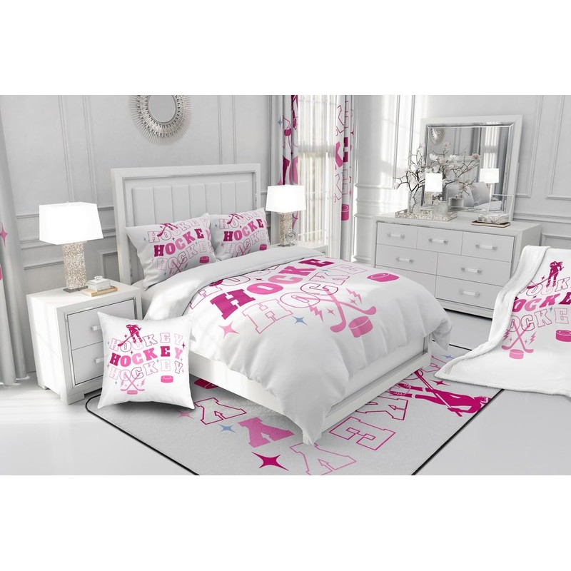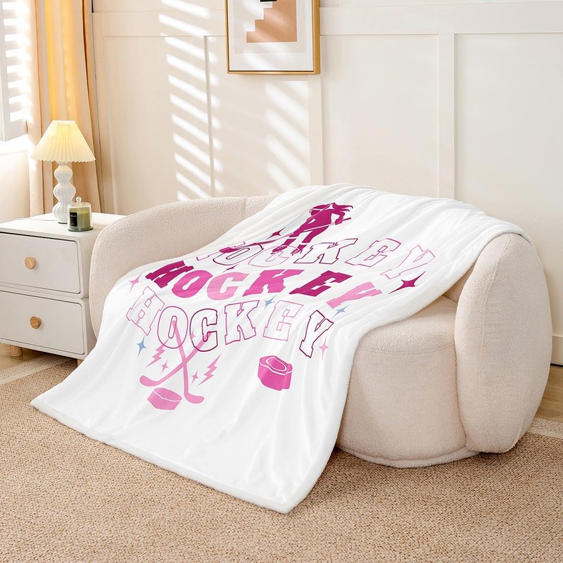 Feelyou Ice Hockey Plush Blanket Hockey Winter Sports Sherpa Blanket for Kids Boys Girls Eat Sleep Hockey Fleece Throw Blanket Pink White Fuzzy Blanket for Sofa Bed Couch,Throw 50x60 Inches