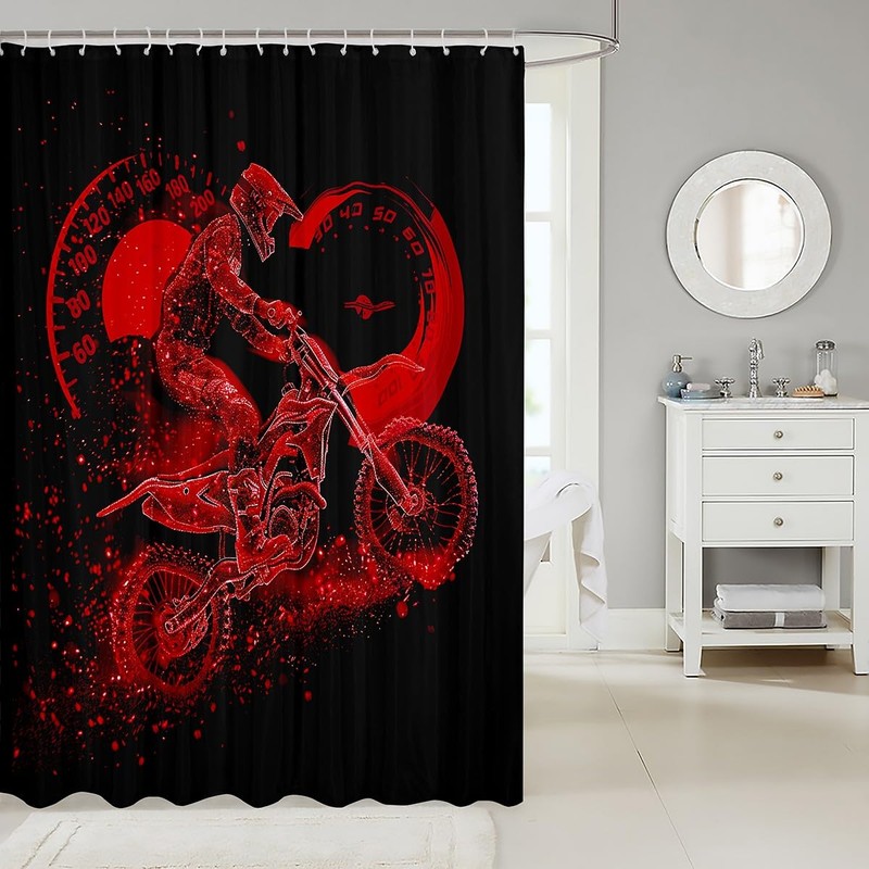 Feelyou Motocross Fabric Shower Curtain Black Red Dirt Bike Rider Shower Curtain Boys Racing Themed Bathroom Waterproof Accessories with 12 Hooks Fashion Motorcycle Silhouette Curtains,72X72 Inches