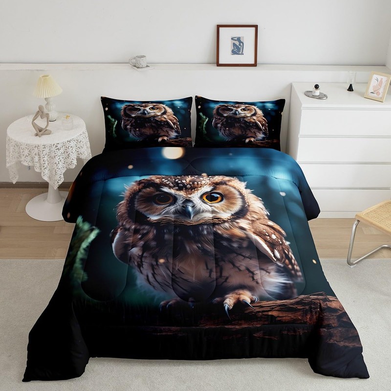 Feelyou Owl Bedding Set Full, Owl Animal Comforter for Kids Boys Girls Cartoon Owl Comforter Set Kids Bird Duvet Set 4Pcs