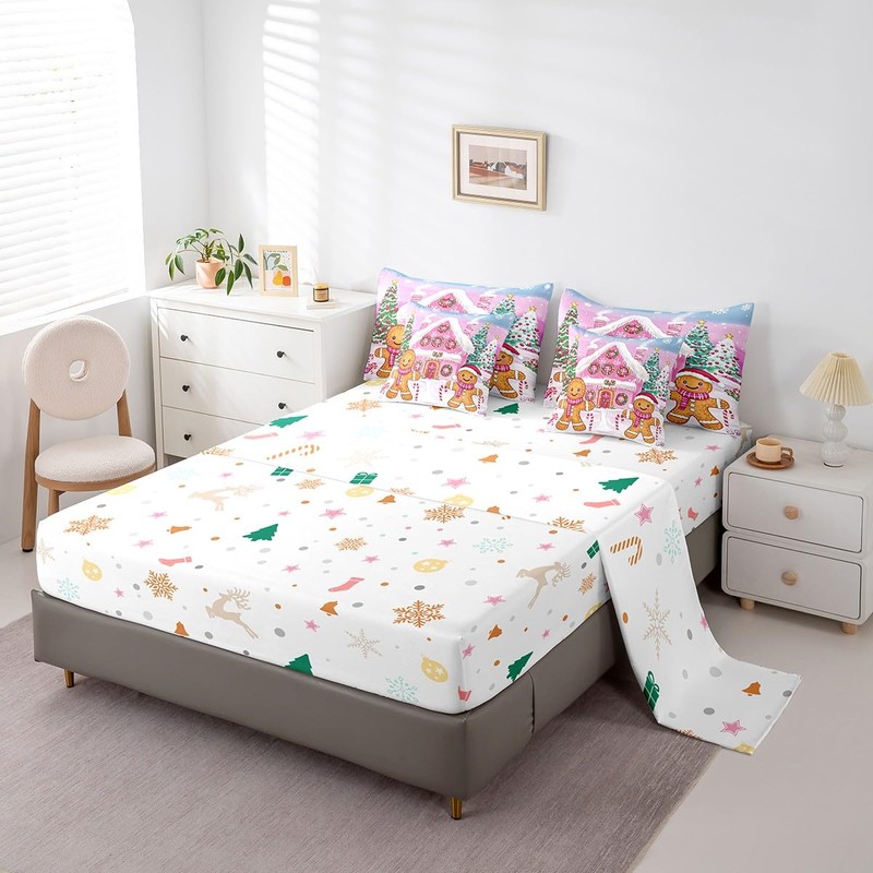 Feelyou Pink Merry Christmas Comforter Set Full 7 Pieces Xmas Tree Gingerbread Man Bedding Set Candy Cane House Winter Happy New Year Bed in a Bag with Comforter, Sheets, Pillowcases & Cushion Cover