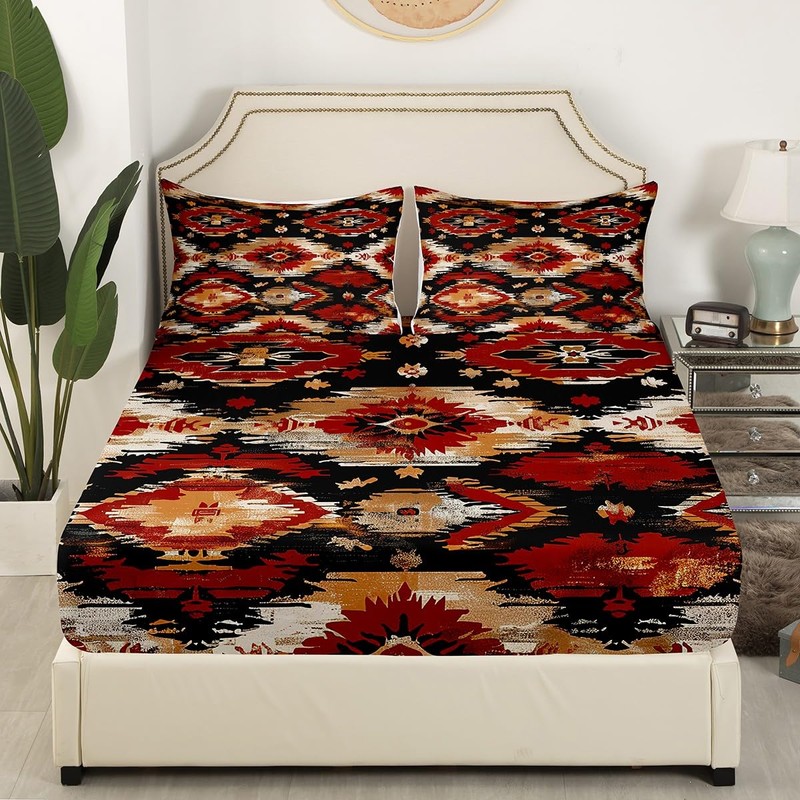 Feelyou Red Southwestern Bed Sheets Set King Size Geometric Sheet Set Tribal Native American Indian Design Vinatge Sheets with Deep Pocket Fitted Sheet Decor Exotic Style Stripe Line Bedding Set