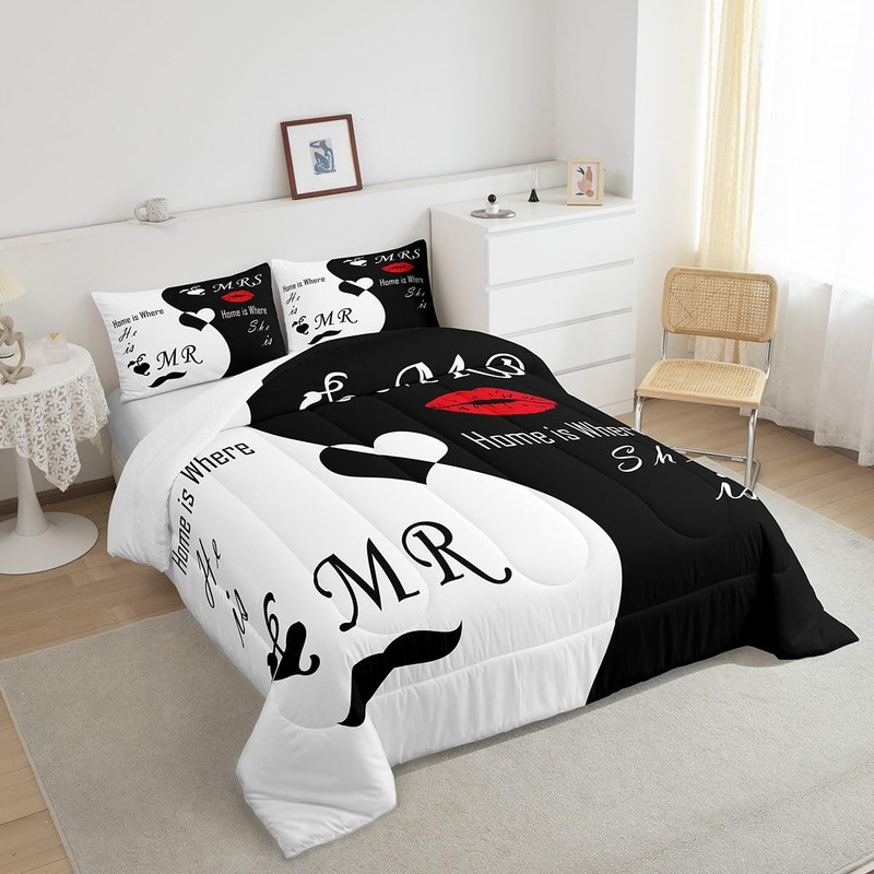 Feelyou Valentine's Day Bedding Set King Size His and Hers Comforter Set for Women Men Black White Comforter Romantic Lover Quilt Set 3Pcs