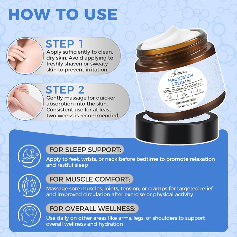 - Calming and Relaxing: Lightweight and fast-absorbing, our magnesium cream promotes muscle relaxation and a healthier night's sleep