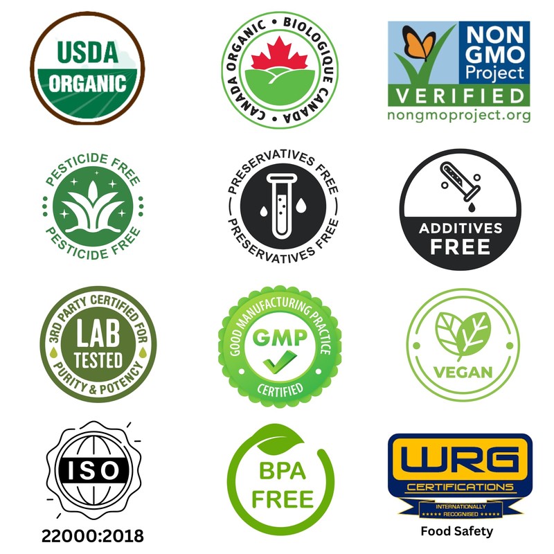 - : ISO certificate number : FSMS-MMXXI-4-8829, Certificate of good manufacturing practice : GMP-MMXXI-4-8830, USDA organic certification by Control Union : CU 889487NOP-01.2023, Feenlo Products Inc Canada Organic Regime CFIA Accreditation # COR00906030