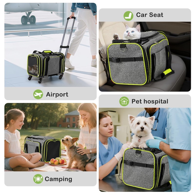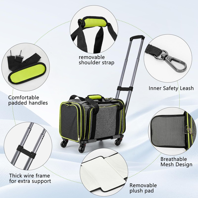 - Breathable & Durable Construction: The airline-certified rolling pet carrier is constructed from scratch-resistant materials, with mesh windows on both the top and sides to ensure excellent ventilation and clear visibility. During hot weather, the side zippered panel can be opened to expand the living space and create additional ventilation access points
