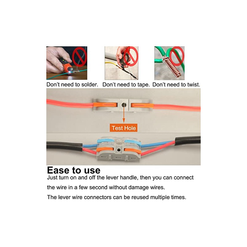 - [Fast Connection] This kind of push wire connectors kit can quickly connect and disconnect wires. It can be reduce wiring time by 70%. Convenient design Provides a secure connection without soldering or crimping. You only need to pull up the orange levers, insert the wires, press the lever handle to close the clamp. Wiring is finish.