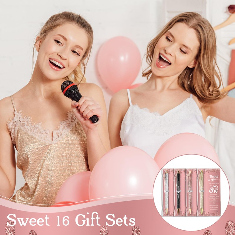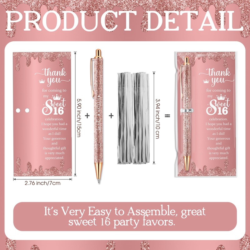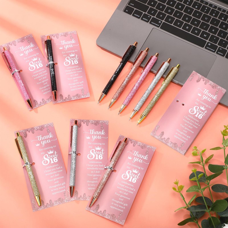 - Party Supplies: our cute, glittery Sweet Sixteen ballpoint pens packaged with pink thank you cards offer the mix of elegance; These pens aren't just functional, but a stylish sweet 16 party favor that your guests can flaunt, reminding them of the fabulous time they had at your event