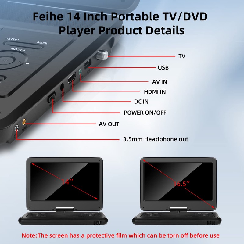 - 【PROTABLE DVD PLAYER WITH TV COMBO】:New version 14 Inch Portable DVD Player built-in Digital TV ATSC Tuner, enjoy your favorite movies and TV shows whenever and wherever you want !(With Amplified Digital TV Antenna,the number of channels that can be searched depends on your region.)