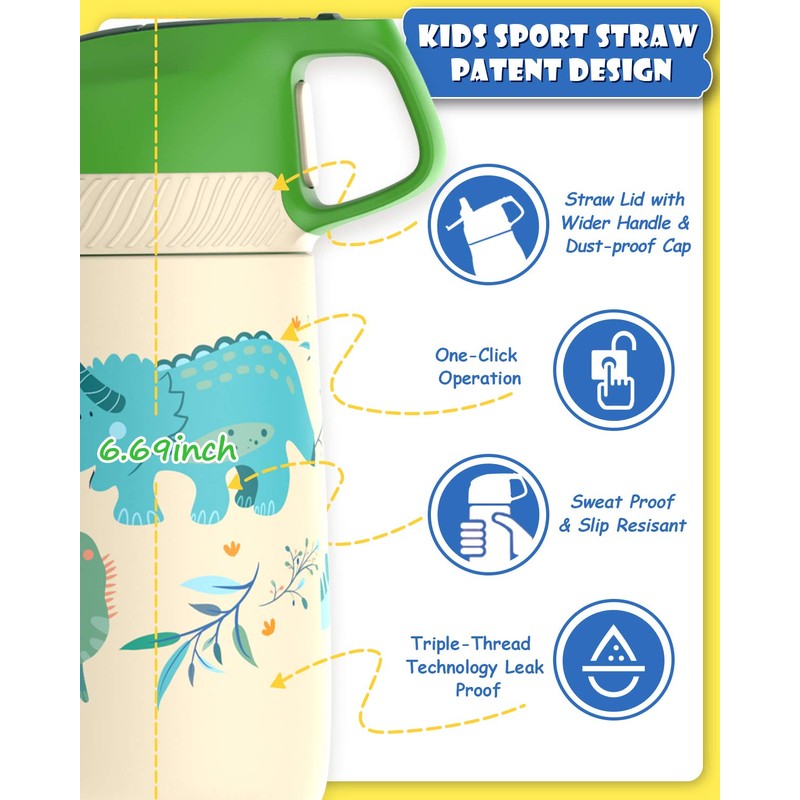 - [DESIGNED FOR KIDS]The One-click Operating System Makes It Easy To Open. Little Kids' Hands Are Easily Able To Operate The Bottle And Drink Comfortably. Patented Design Dust-proof Lid Allows For Healthy Daily Water Drinking.