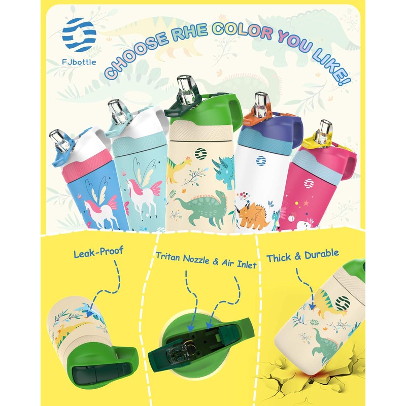 FEIJIAN Kids Stainless Steel Water Bottles with Straw, 12 oz Leak Proof Insulated Water Bottle Double Wall, Keep Drinks Hot Cold Toddler Thermos with Handle BPA-Free for School