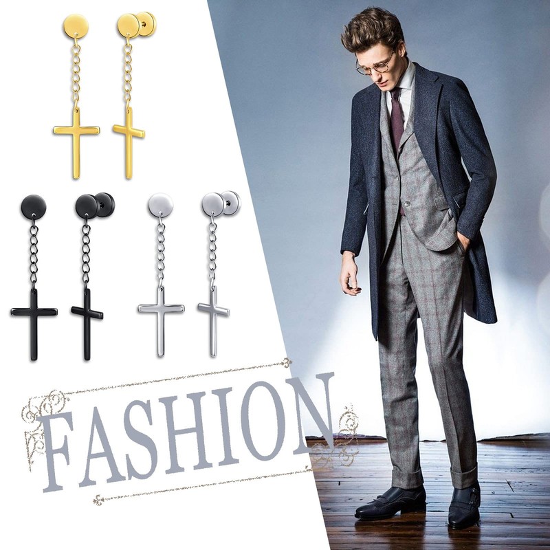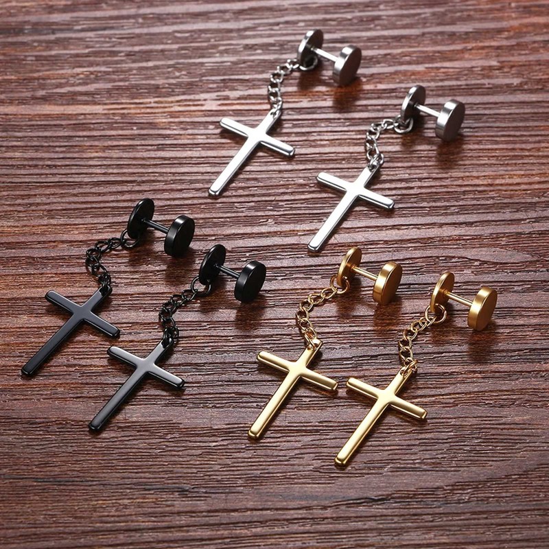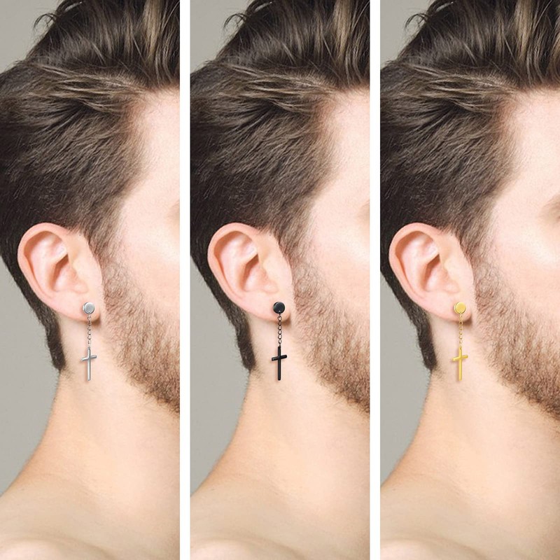 feilok 3 pairs Cross Huggie Dangly Stainless Steel Huggie Hoops Ear Drop Stud Earrings for Men Women