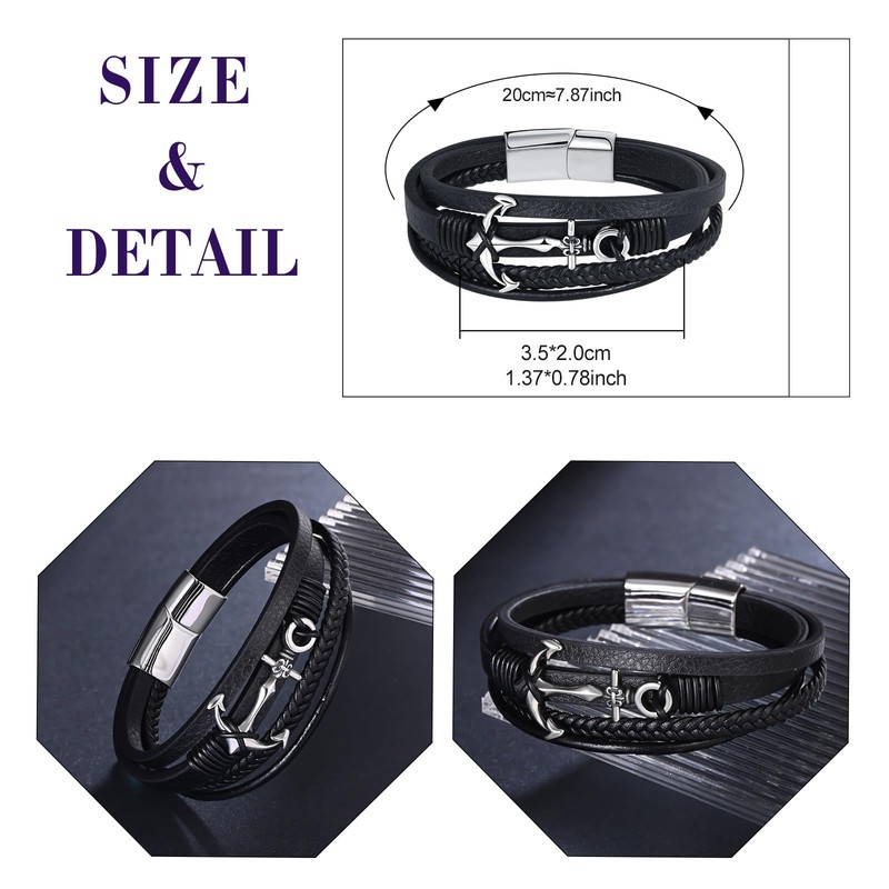 Feilok Leather Bracelet Multi Layer Wristbands Anchor Men's Leather Bracelet Punk Bracelet with Magnetic Clasp Braided