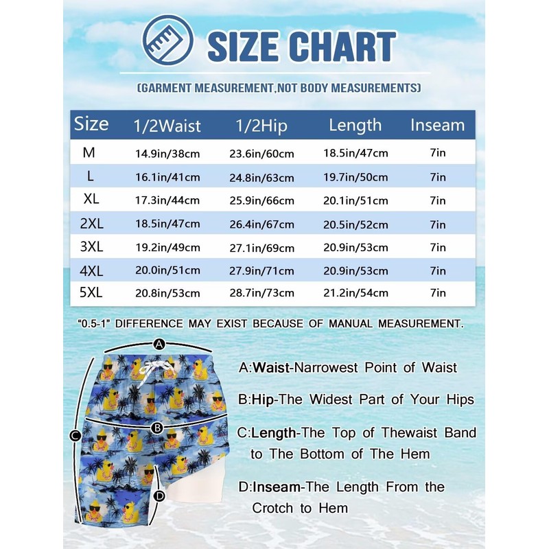 • [AVAILABLE IN VARIOUS SIZES, SATISFACTORY SERVICE] Our men's duck swim trunks are available in 7 sizes (M, L, XL, XXL, 3XL, 4XL, 5XL). If you prefer a tight fit you can go one size smaller, if you prefer a loose fit you can choose according to the size chart. Our tropical duck swimming trunks can bring a different feeling to your sports and let you enjoy your sports time. If you are not satisfied with our men board shorts, please feel free to contact us. Your satisfaction is our goal.