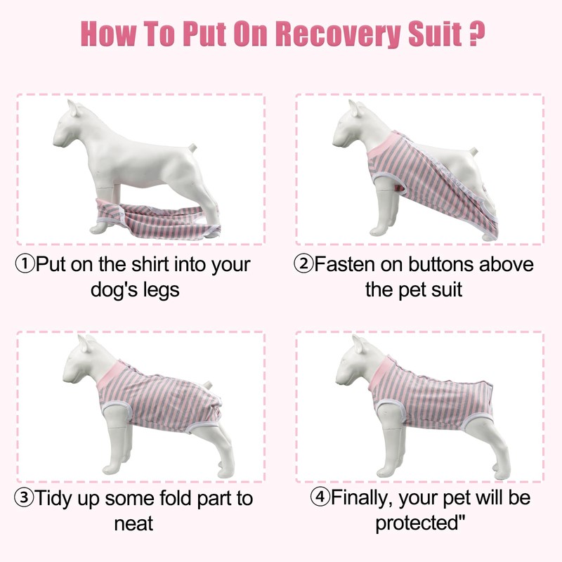 - Multiple uses: Puppy spay recovery suit can be used for neutering male dogs, spaying female dogs, weaning, caring for abdominal wounds in dogs and cats. Avoid post-surgical infections caused by scratching, licking or soiling, and relieve your pet's anxiety. Our dog spay T-Shirt can also be used for dog allergies, skin diseases, scratching and other conditions.