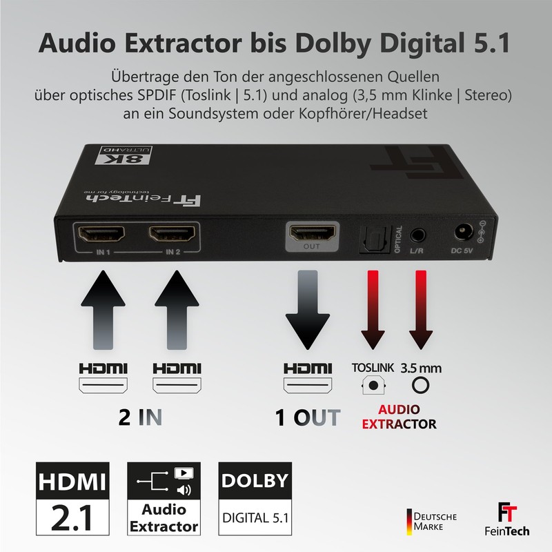 FeinTech SW212 HDMI 2.1 Switch 2 in 1 Out with HDMI Audio Extractor 4K 120Hz and Automatic Switching 8K 60Hz VRR ALLM Audio Splitter to Optical SPDIF Toslink and 3.5 Jack