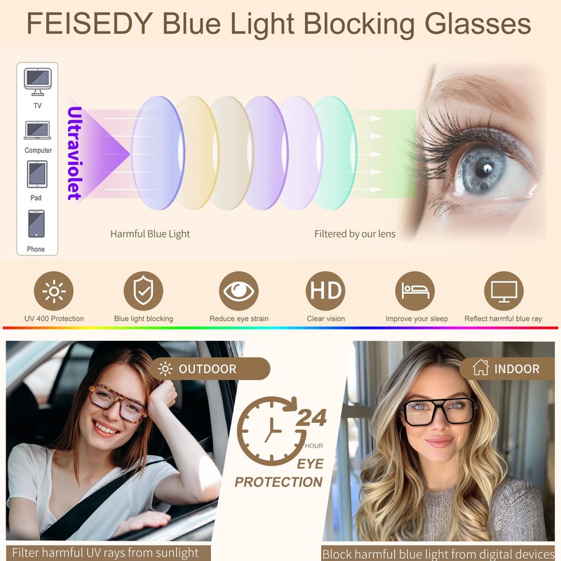 • FEISEDY anti-blue light glasses can effectively resist harmful blue light from digital screens, and can significantly reduce eye fatigue, glare, headaches, migraines caused by games or reading mobile TV digital displays, and protect your glasses.