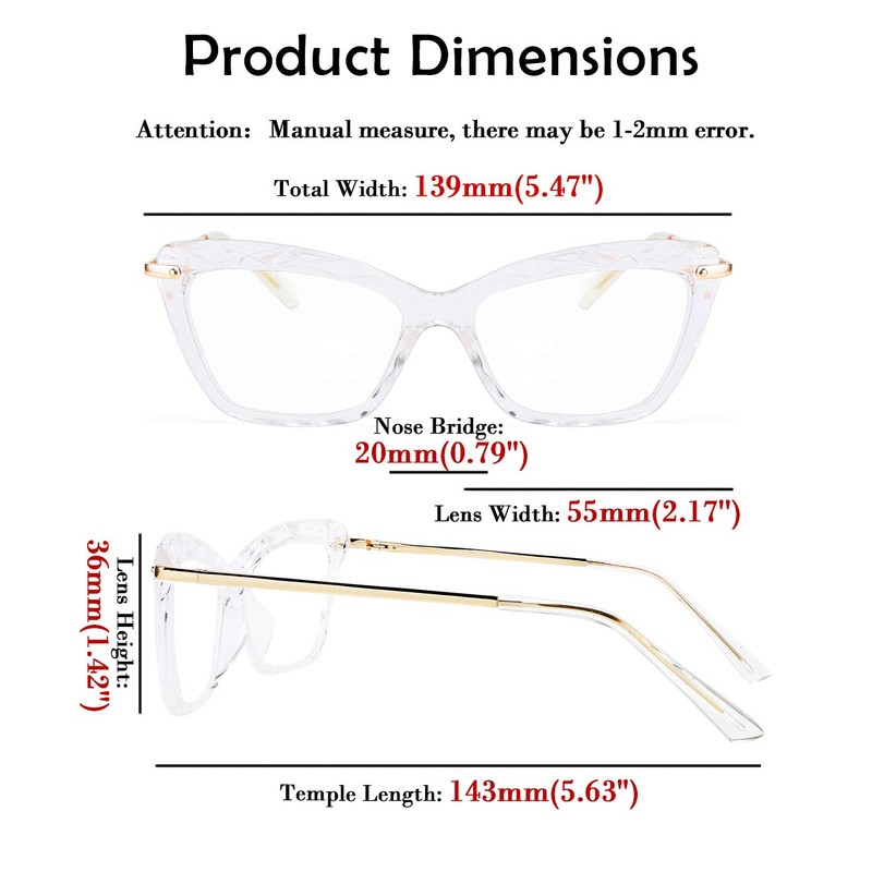 - FEISEDY Product Dimensions -- Lens Width: 55MM(2.17''); Lens Height: 36MM(1.42''); Temple Length: 143MM(5.63''); Nose Bridge: 20MM(0.79''), Frame Width: 139mm(5.47'').