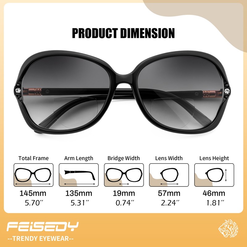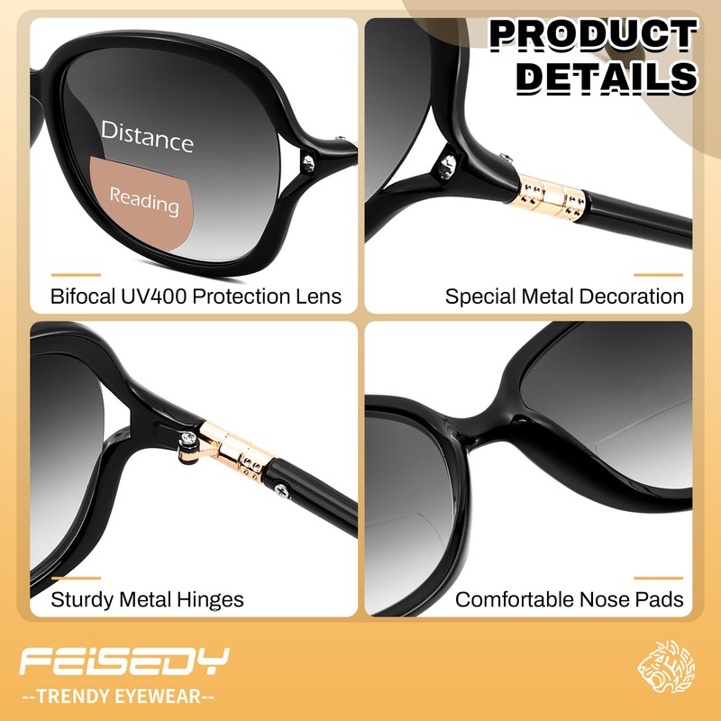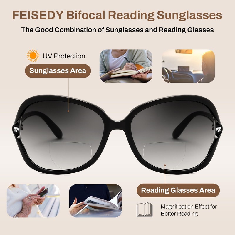 - [Special Two-in-One Bifocal Design] One pair of bifocal reading sunglasses have the functions of sunglasses and reading glasses in one.Wearing it, while blocking the sun, you could also read books or digital device at the beach, outdoor gardens. You can wear bifocal sunglasses all day long without having to switch to reading glasses