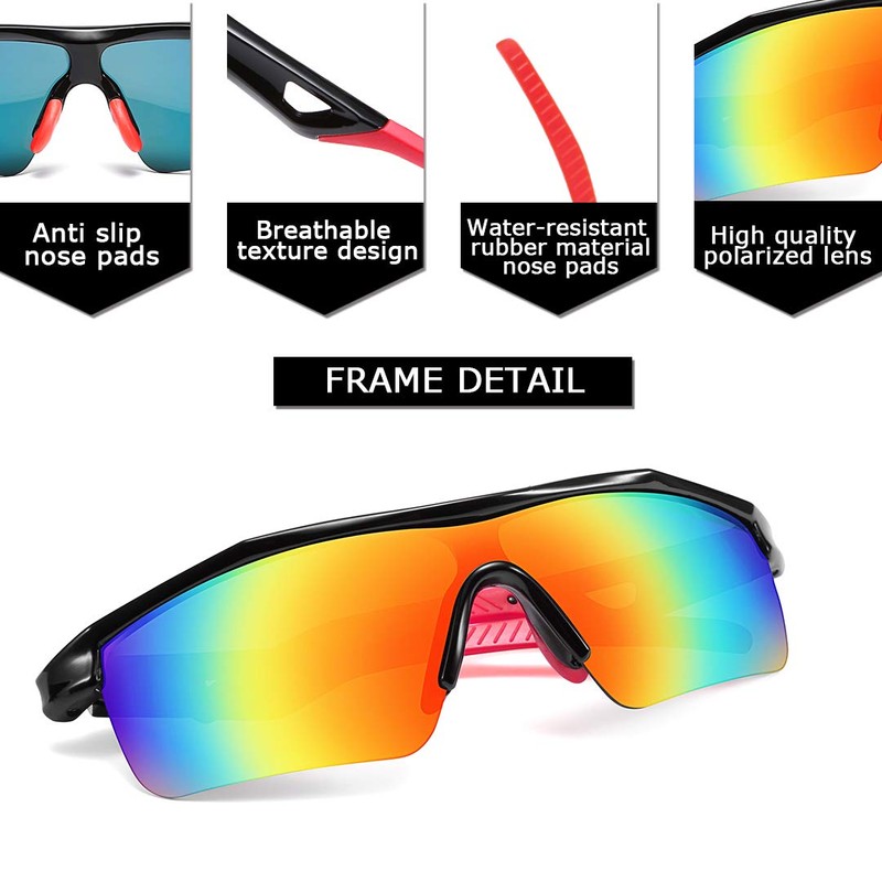 The Sunglasses Frame is painted with a glossy finish. The temples are made of UNOBTANIUM water-resistant rubber material, which improves the friction between the temples and cheeks when sweating. The three-point fit technology optimizes comfort. The glasses are lightweight and comfortable to wear for long periods of time. The nose pads are reinforced with screws and will not fall off in all kinds of occasions. The nose pads are also made of UNOBTANIUM materials with anti-slip properties.