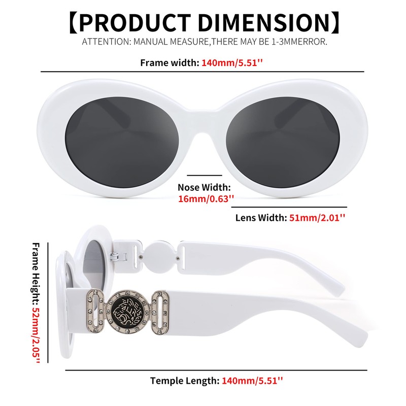 - Product Measurements - Lens Width: 51mm/2.01'', Frame Height: 52mm/2.05'', Nose Pads Width: 16mm/0.63'', Frame total width: 140mm/5.51'', Temple Length: 140mm/5.51''. [Manual measurement, there may be 1-3 mm deviation]