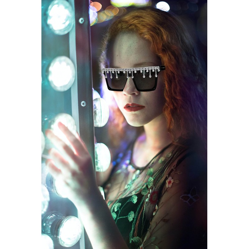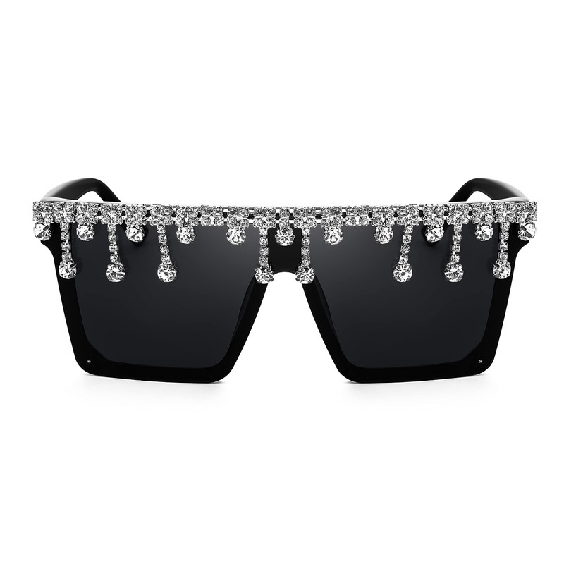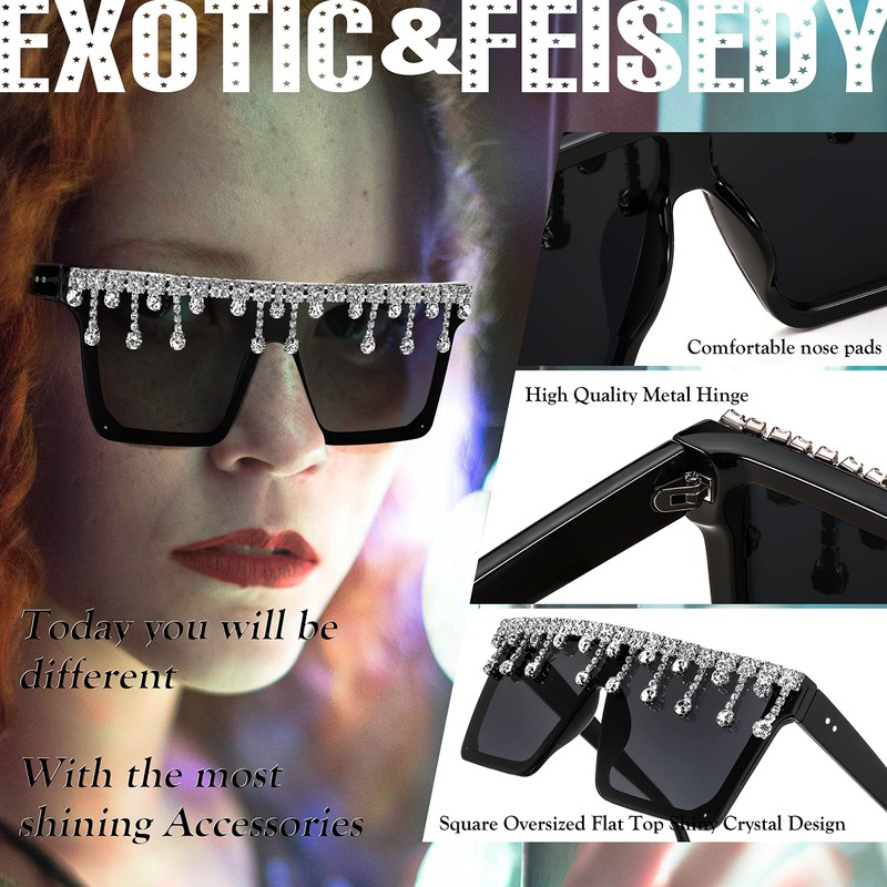 - FEISEDY Fashion Crystal Design - Shiny Crystal Tassels Sparkling decorated Oversized Square Trendy Shades Flat Top Visor, which enhances the fashion sense of the glasses. Quickly attract attention in the crowd. Delicate crystal embellishment, full of exotic atmosphere