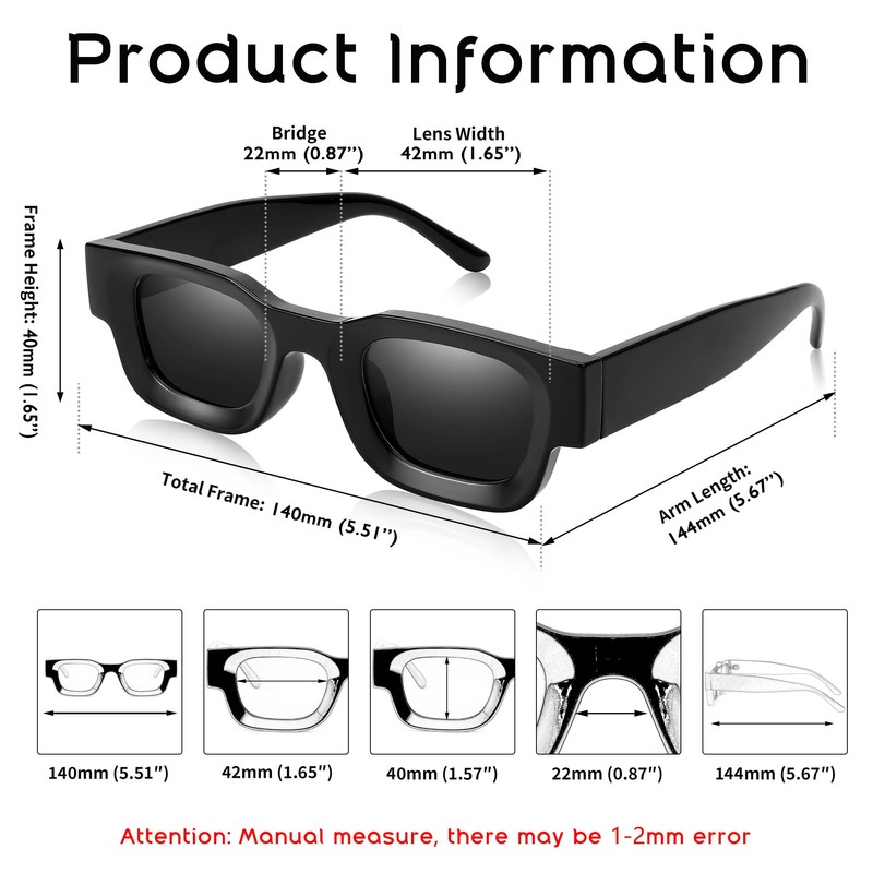 - Dimensiones del producto - Ancho de la lente: 47 mm (1,85 pulgadas) | Altura de la montura: 40 mm (1,57 pulgadas) | Ancho del puente: 19 mm (0,75 pulgadas) |Total de la montura: 141mm (5.55inches) | Longitud del brazo:144mm (5.67inches)