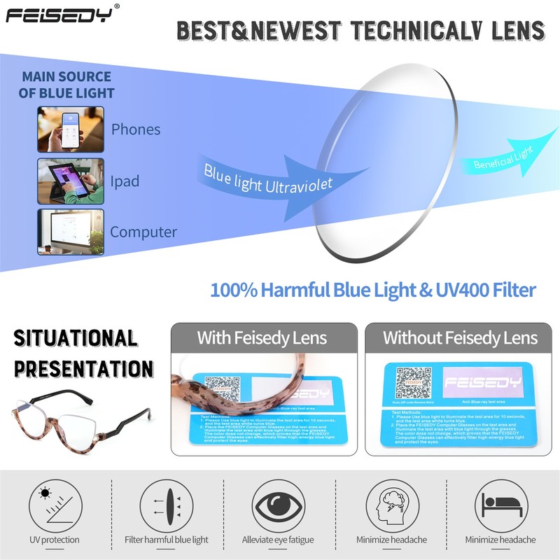 - Reading Glasses for Women - FEISEDY anti-blue light lenses help you block almost 100% harmful blue light in mobile phones, computers, TVs, LED lights and other electronic products to prevent glare, reduce eyestrain and headache. Bring you better sleep and better spirits. Enjoy your digital time with FEISEDY anti-blue light lenses!