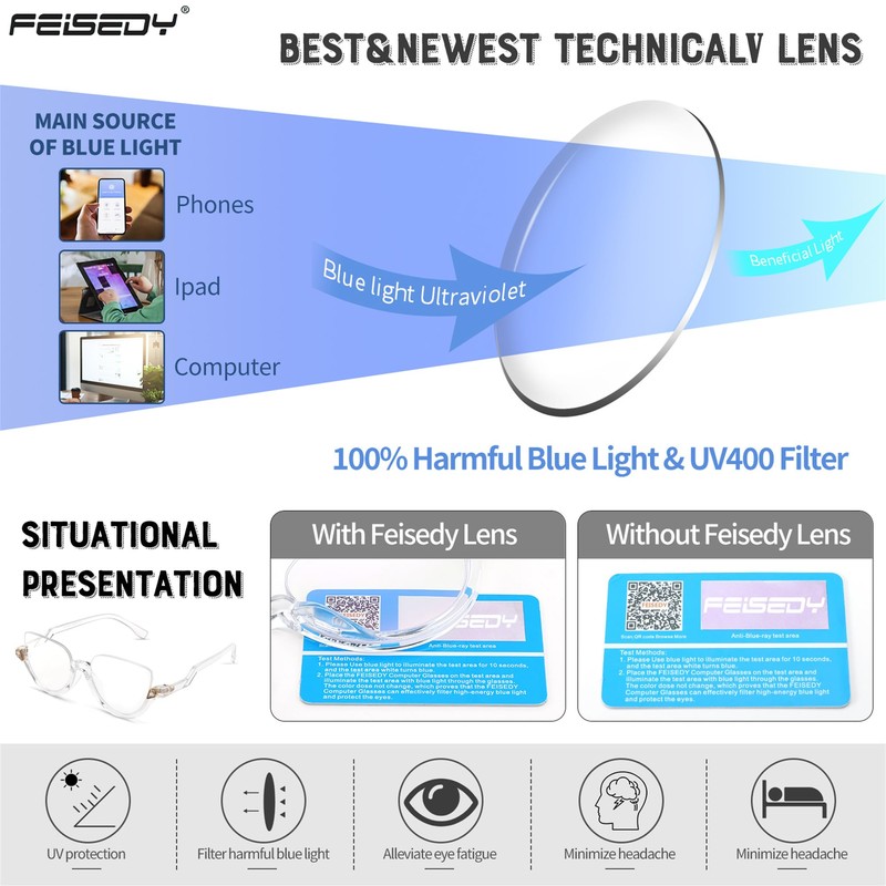 - Reading Glasses for Women - FEISEDY anti-blue light lenses help you block almost 100% harmful blue light in mobile phones, computers, TVs, LED lights and other electronic products to prevent glare, reduce eyestrain and headache. Bring you better sleep and better spirits. Enjoy your digital time with FEISEDY anti-blue light lenses!