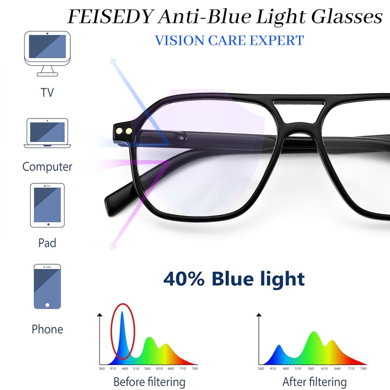 - [ Blue Light Blocking ] FEISEDY anti-blue light glasses can effectively resist harmful blue light from digital screens, and can significantly reduce eye fatigue, glare, headaches caused by games or reading mobile TV digital displays, and protect your eyes.