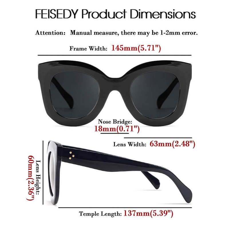 • Product Dimensions -- Lens Width(with frame): 63mm(2.48''), Lens Height: 60mm(2.36''), Temple Length: 137mm(5.39''), Nose Bridge: 18mm(0.71''), Frame Width: 145mm(5.71''). Attention: Manual measure, there may be 1-2mm error.