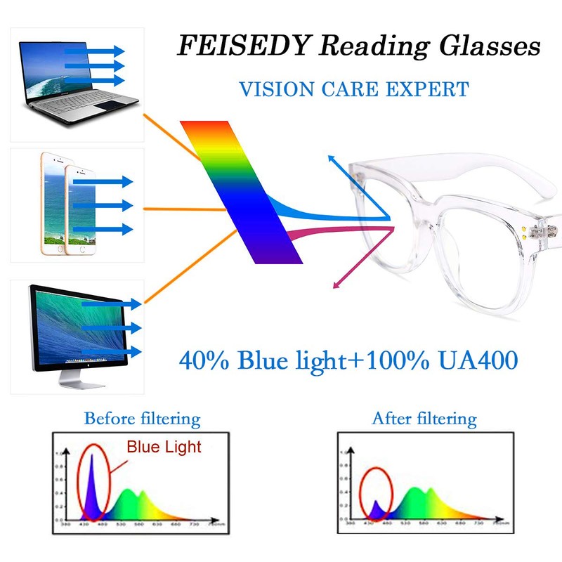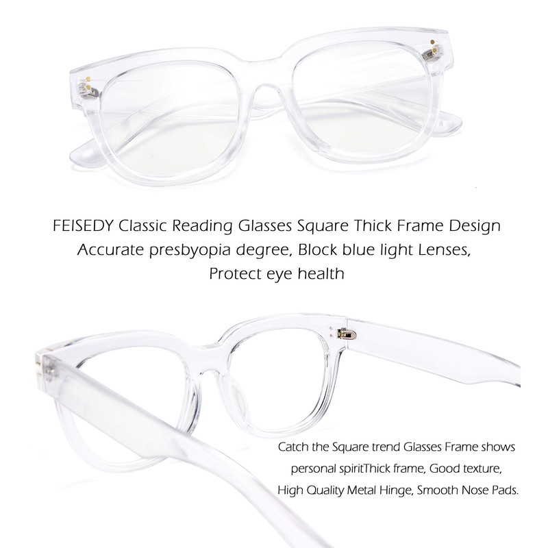- FEISEDY Reading Glasses - Classic Brand Design Square Thick Frames make you more stylish. Nice quality frame, Accurate presbyopia degree, Block blue light Lenses, Protect eye health
