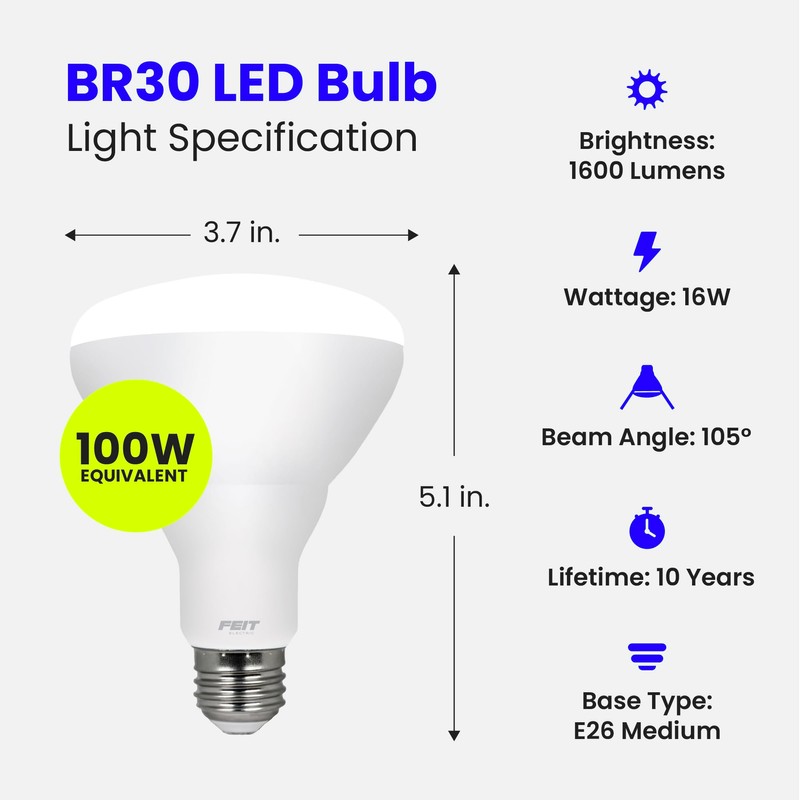 Enjoy all the benefits of advanced LED energy-saving technology with Feit Electric 100BR30DM85010KLED/6 multipack BR30 16W high-CRI LED light bulbs. This dimmable 5000K Daylight LED will replace a 100-watt incandescent bulb. It produces a similar light output of 1400 lumens using only 16 watts of electricity - up to 84% less than a standard incandescent light bulb. These BR30 bulbs have an average life of 11,000 hours/10 years, are RoHS compliant, and are 100% mercury free. Its Daylight glow provides even, energizing light, all while saving energy and lasting for a decade or more.