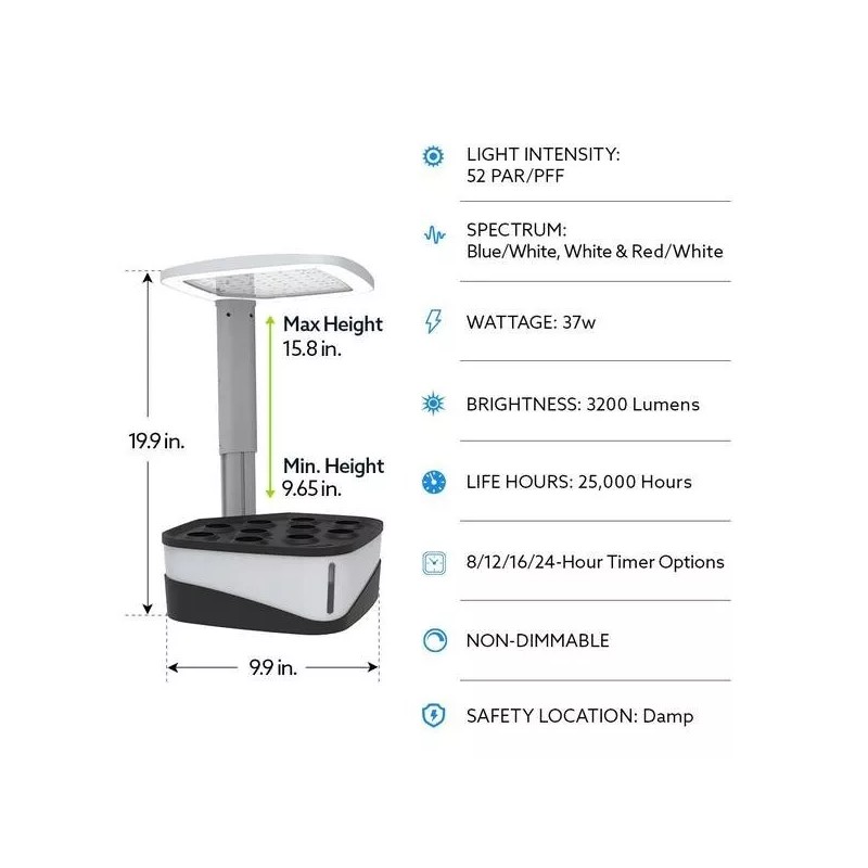 Grow better, stronger plants with the Feit Electric GLP20/TABLE/37-Watt/LED portable tabletop grow light. Rated for high humidity, this plant light is ideal for soil or hydroponic gardens, assisting all phases of indoor plant growth. Variable color spectrum modes can support plant vegetative growth, seeding or flowering and a built-in timer can automatically keep 8-hour, 12-hour or 16-hour light cycles. Integrated energy-efficient LEDs are rated to last 25,000-hours and generate little heat, saving crops from burn damage. Choose a no humming, dependable grow lighting fixture for your hydroponic needs.