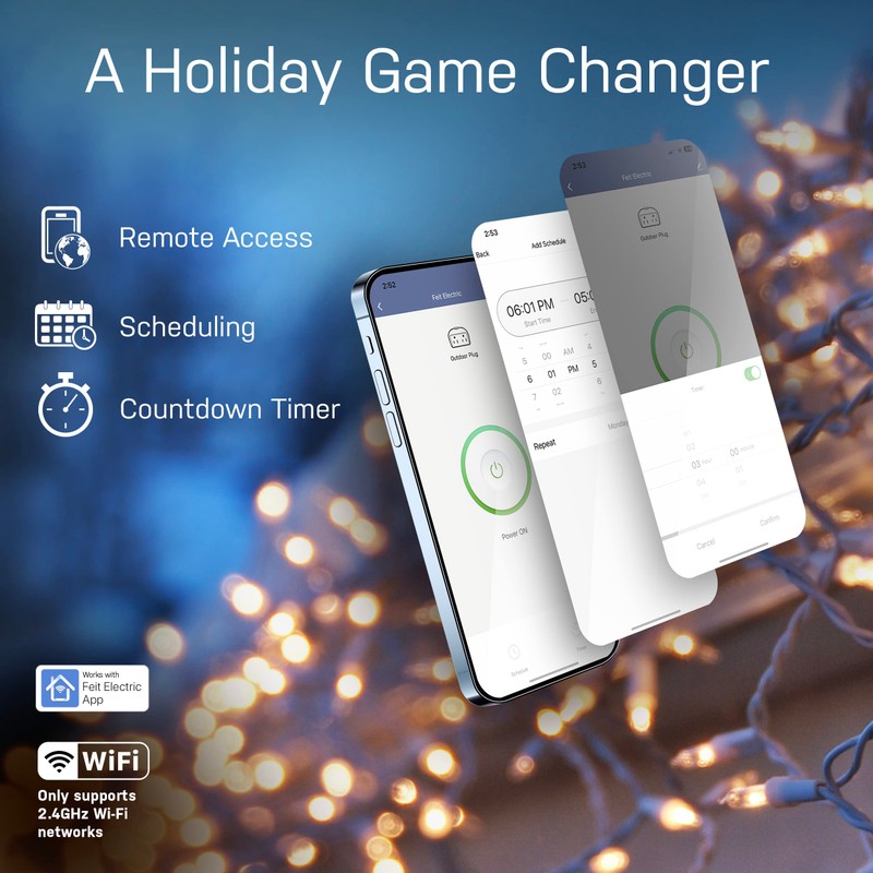 - ✅ HOLIDAY GAME CHANGER – With the Feit Electric app you can control entire rooms, unique groupings, or set a schedule to turn your appliances off/on making it perfect for outdoor holiday lights.