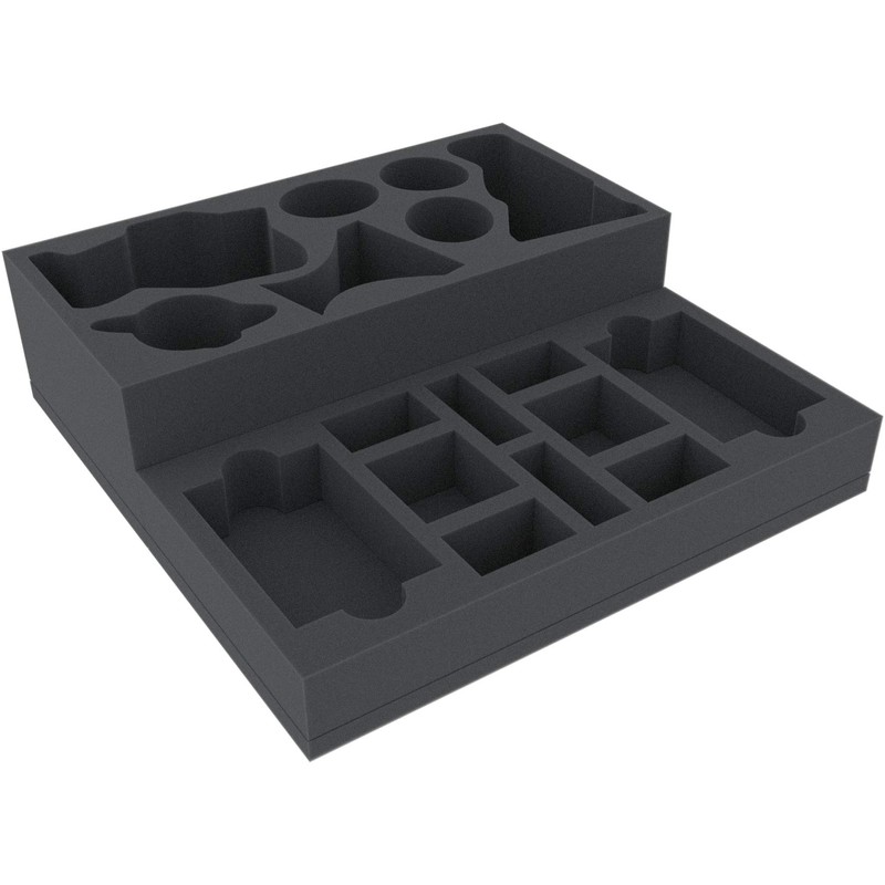 - The set consists of three custom-made foam trays for all 19 miniatures and all the game material from the box, as well as a matching foam topper. The larger cardboard parts - the dungeon board, the dashboards and the rulebook - are placed on top.