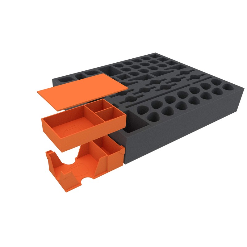 • The set consists of a Feldherr foam tray, tailor-made for all figures and some of the accessories, a card holder and a token box made of 3D printed plastic, as well as a matching foam topper.