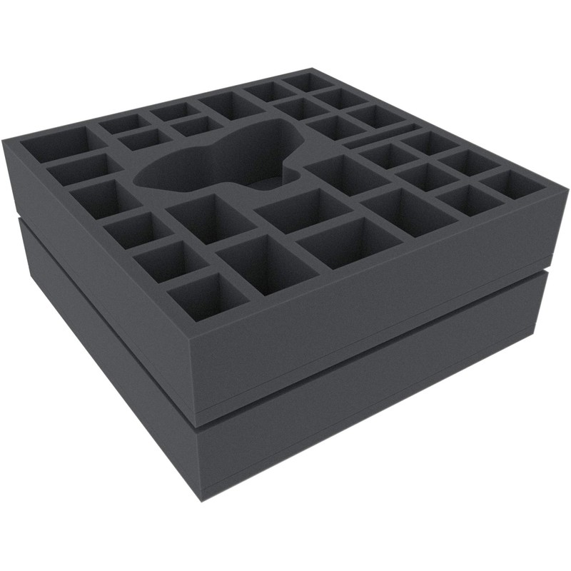 - The set consists of two foam inserts to safely and neatly store all 30 miniatures and all the play material of the expansion. Plus matching foam lid. The lid of the board game box stands approx. 5-6 cm across. Includes Flex Cross Band green (size L) for a stable fit of lid and box.